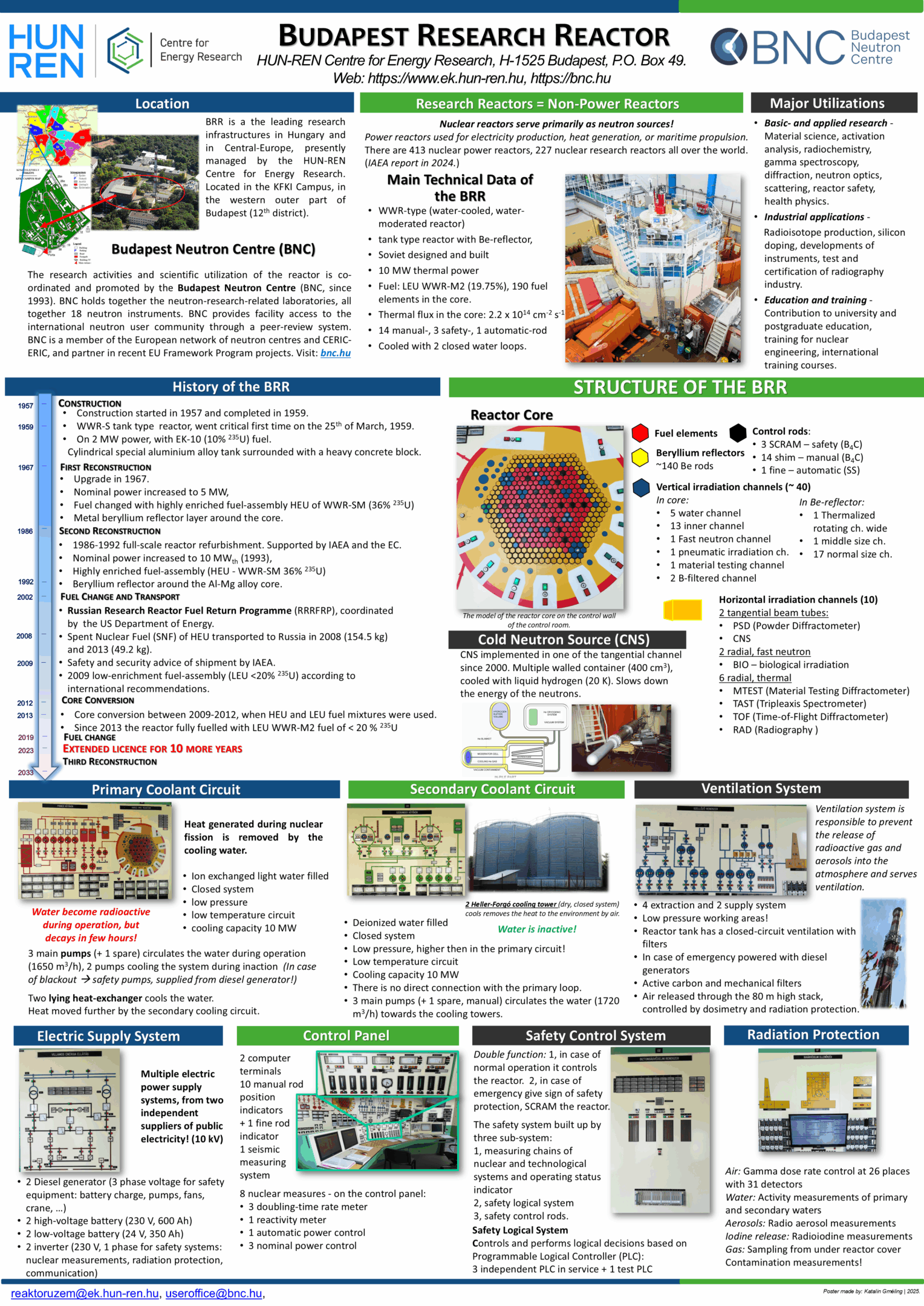 The Budapest Research Reactor (BRR) is a VVR-type (water-cooled, water-moderated) Soviet design reactor. It went critical in 1959. The initial thermal power was 2 MW. The first upgrade took place in 1967 when the power was increased to 5 MW using a new type of fuel and a beryllium reflector. A full-scale reactor reconstruction and upgrade project started in 1986, and finished in December 1992. The upgraded 10 MW reactor received the operation license in November 1993. According to Hungarian Atomic Energy Authority (OAH) regulations, a periodic safety review must be performed in every 10 years. To maintain the operational license, such reviews were conducted in 2003, 2013 and 2023. The OAH has extended the operating license of the BRR until 2033.
